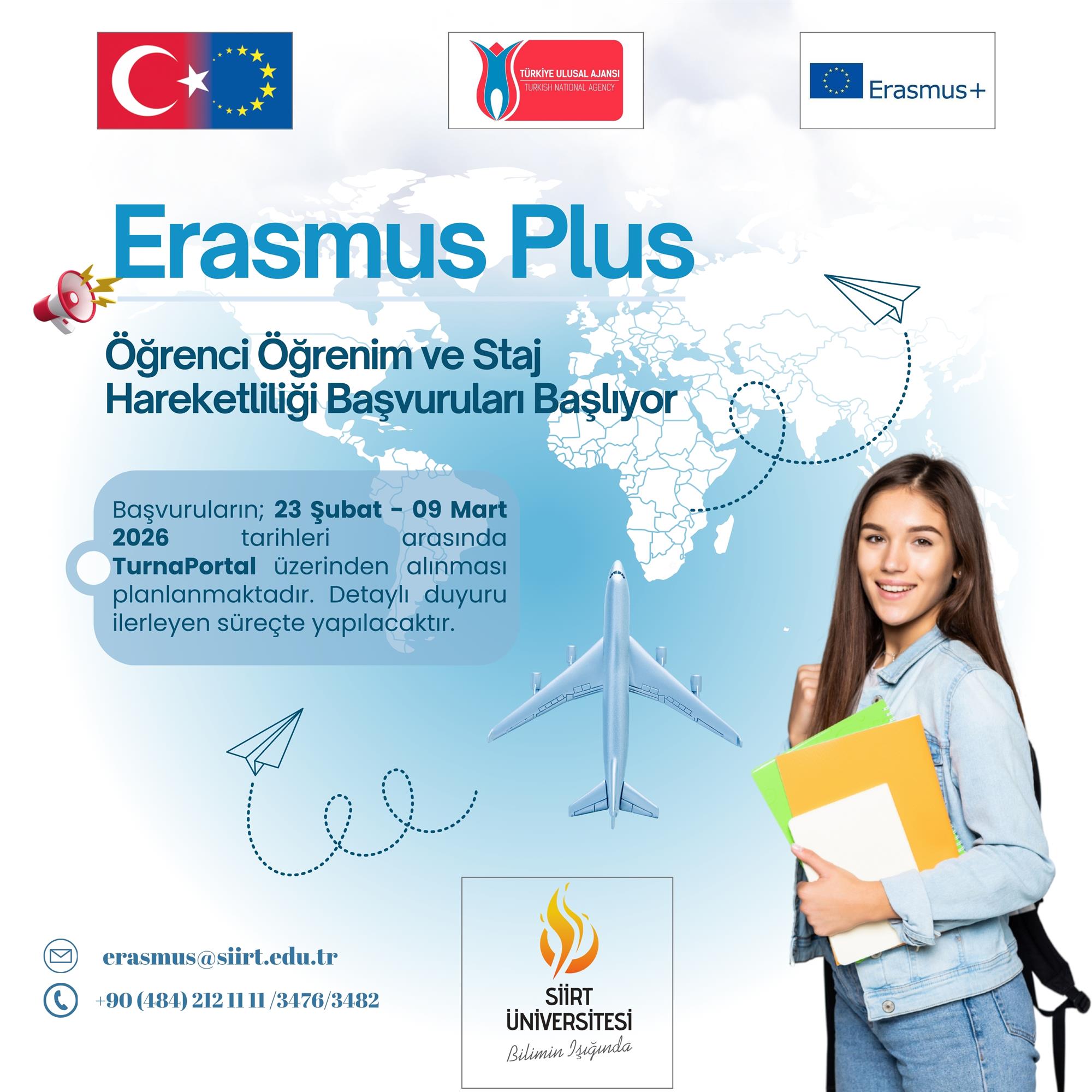 2025-1-TR01-KA131-HED-000316878 numaralı proje kapsamında, 2026/2027 Akademik Yılı Erasmus Plus Öğrenci Öğrenim ve Staj Hareketliliği başvurularının, 23.02.2026 ve 09.03.2026 tarihleri arasında TurnaPortal sistemi üzerinden alınması planlanmaktadır.