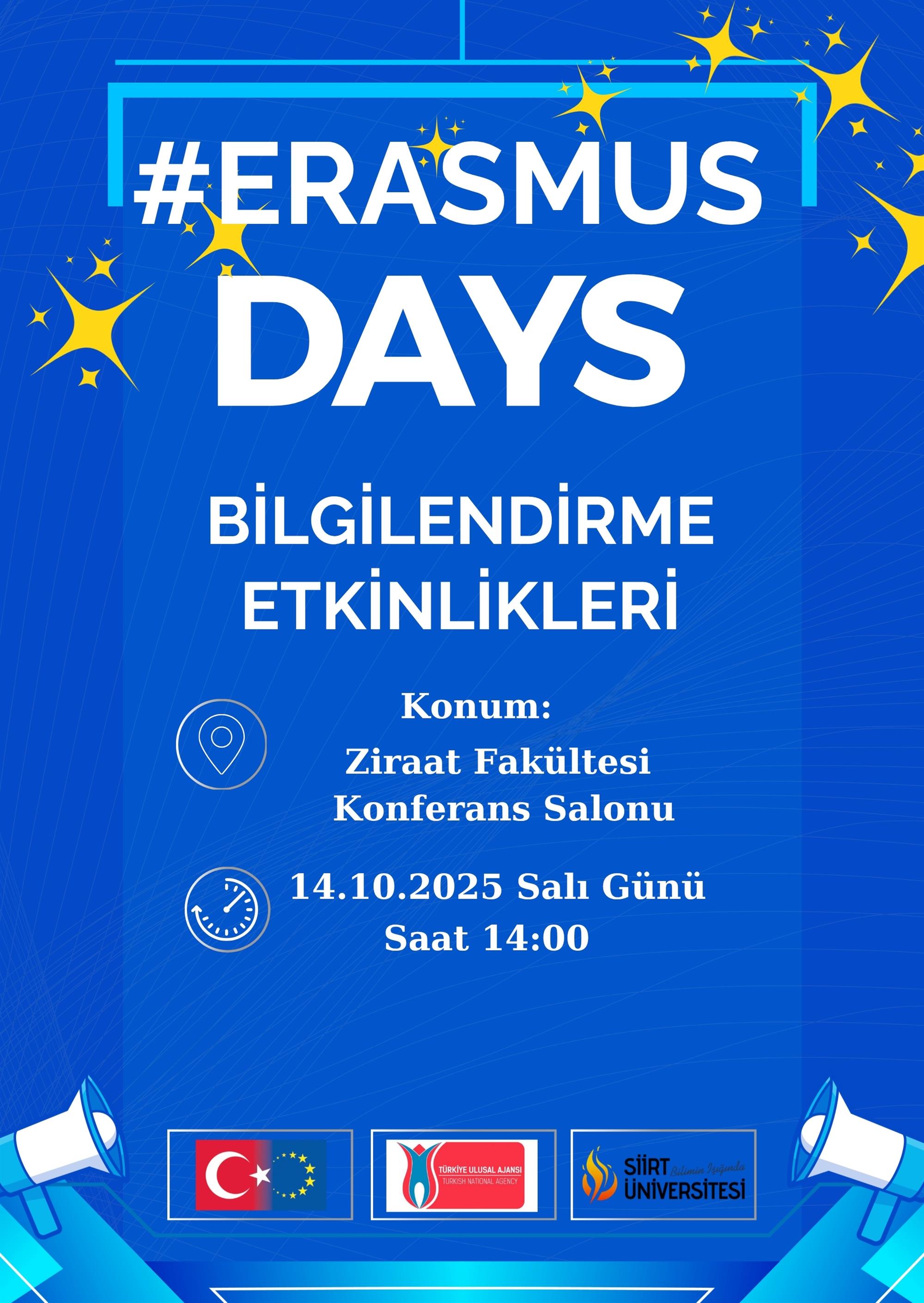 T.C. Ulusal Ajansının belirttiği üzere Erasmus Günleri (#ErasmusDays) bu sene 13-18 Ekim 2025 tarihlerinde tüm dünyada kutlanacak. Ülke çapındaki etkinliklere Siirt Üniversitesi de katılıyor.