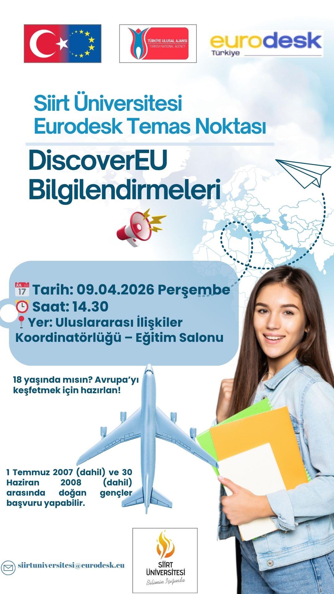9 Nisan 2026 Perşembe günü yapılan Etkinlikte, 18 yaşındaki gençlere Avrupa’yı keşfetme fırsatı sunan DiscoverEU programı hakkında kapsamlı bilgiler paylaşıldı. Katılımcılar, başvuru süreci, seyahat imkanları ve programın sunduğu avantajlar hakkında detaylı şekilde bilgilendirildi.